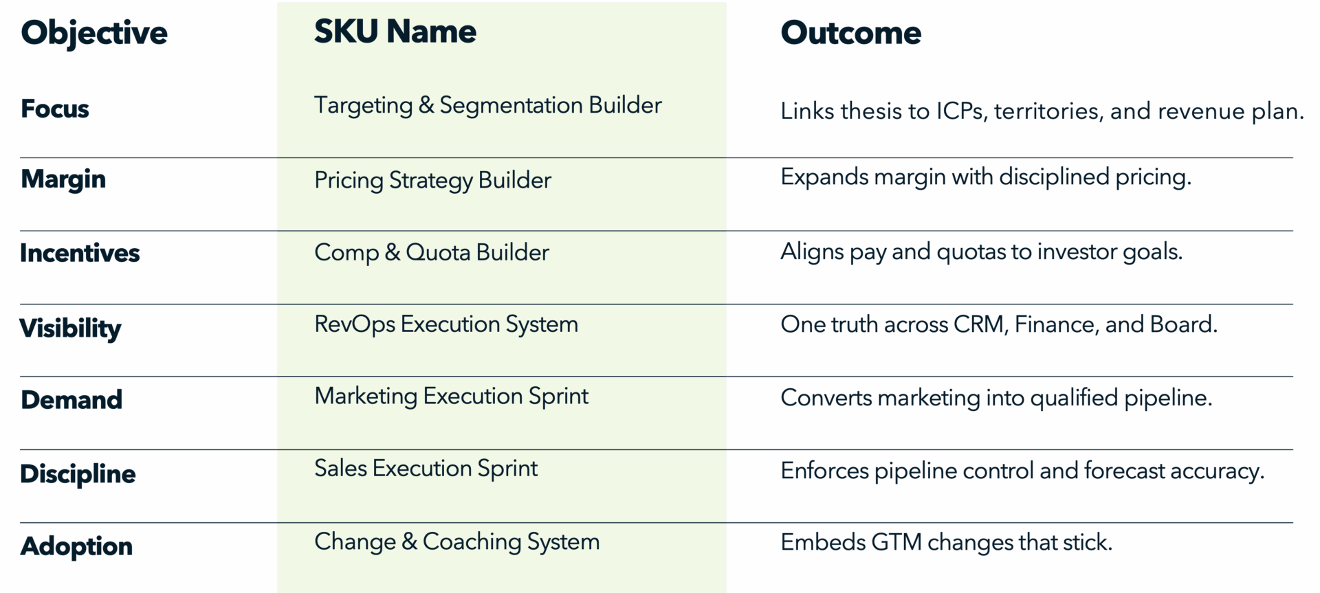 Every challenge we solve connects a growth objective to a proven execution system. Each SKU delivers a focused solution that drives measurable outcomes, protects value, accelerates results, and ensures strategy turns into traction.